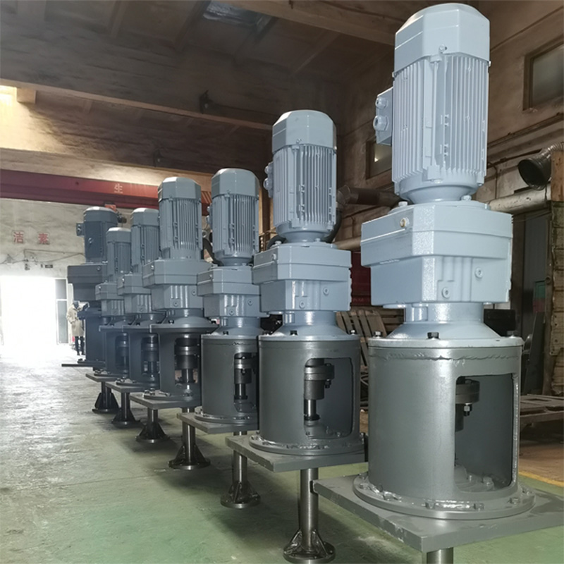 錨式框式攪拌器這種攪拌器的旋轉(zhuǎn)半徑與容器內(nèi)徑基本相等,間隙小,轉(zhuǎn)速低。這種攪拌器只是在槳葉外緣與容器內(nèi)壁之間產(chǎn)生較強(qiáng)的剪切作用,且攪動范圍大,因此,對高粘度液體的攪拌比較適宜。在某些生產(chǎn)過程中,這種攪拌器還可以用來防止器壁沉積現(xiàn)象。錨式和框式攪拌器基本上不生產(chǎn)軸向流動,故難以保證釜內(nèi)軸向的混合均勻。渦輪式攪拌器生產(chǎn)一般高速液流從徑向射出,夾帶周圍的流體形成流動。轉(zhuǎn)速較高,適用于低粘度或中等黏度的液體攪拌。造成的總體流動回路較為曲折,出口速度很大,槳葉外緣附近造成激烈的旋渦運(yùn)動和很大的剪切力,可將液體微團(tuán)分散得很細(xì)。因此,渦輪攪拌器對于要求小尺度均勻的攪拌過程更為適用。但是,渦輪攪拌器的釜內(nèi)有兩個回路,對于易分成的物料不合適。槳式攪拌器葉片數(shù)一般為2-4片,葉片型式可分為平直葉式和折葉式兩種。液液系中用于防止分離、使罐的溫度均一,固液系中多用于防止固體沉降。主要用于流體的循環(huán),由于在同樣排量下,折葉式比平直葉式的功耗少,操作費(fèi)用低,故軸流槳葉使用較多,也用于高粘流體攪拌,促.進(jìn)流體的上下交換,代替螺帶式葉輪,能獲得很好的效果。槳式,推進(jìn)式,渦輪式和錨式攪拌器在攪拌反應(yīng)設(shè)備中使用廣泛。
